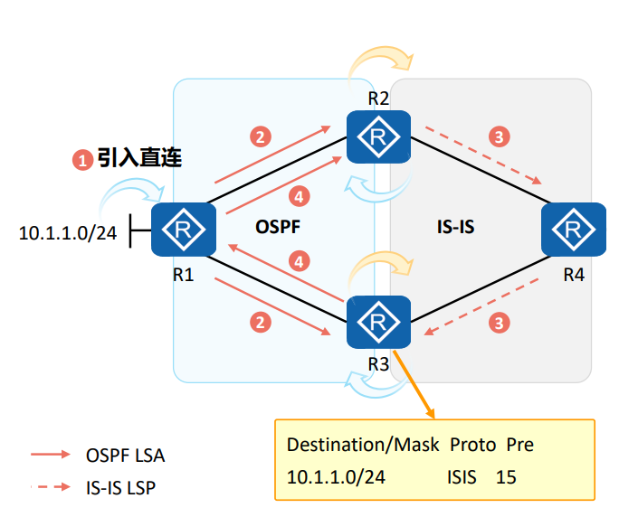 R2、R3执行双向路由重发布,R2先将10.1.1.0/24重发布到IS-IS中,R3将会学习到来自R4的IS-IS路由。