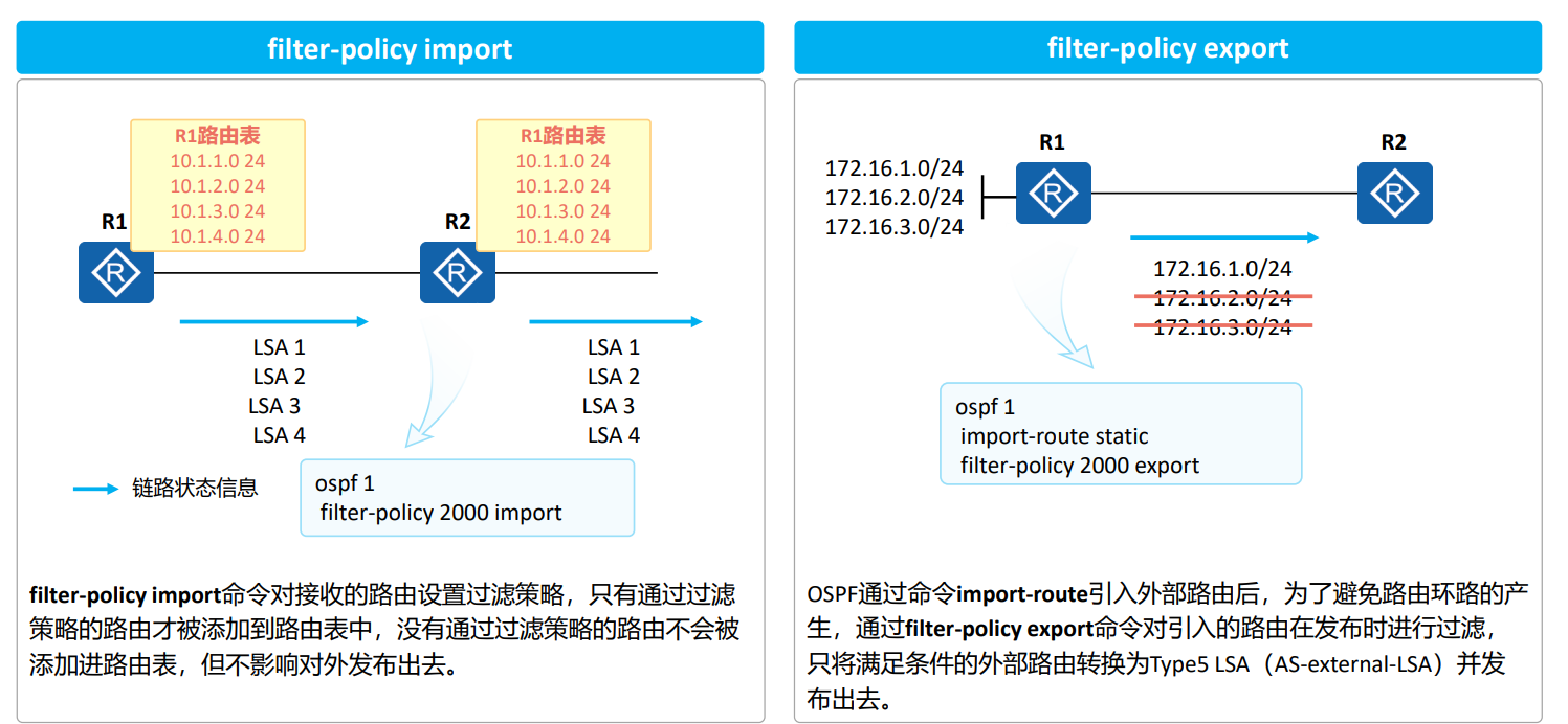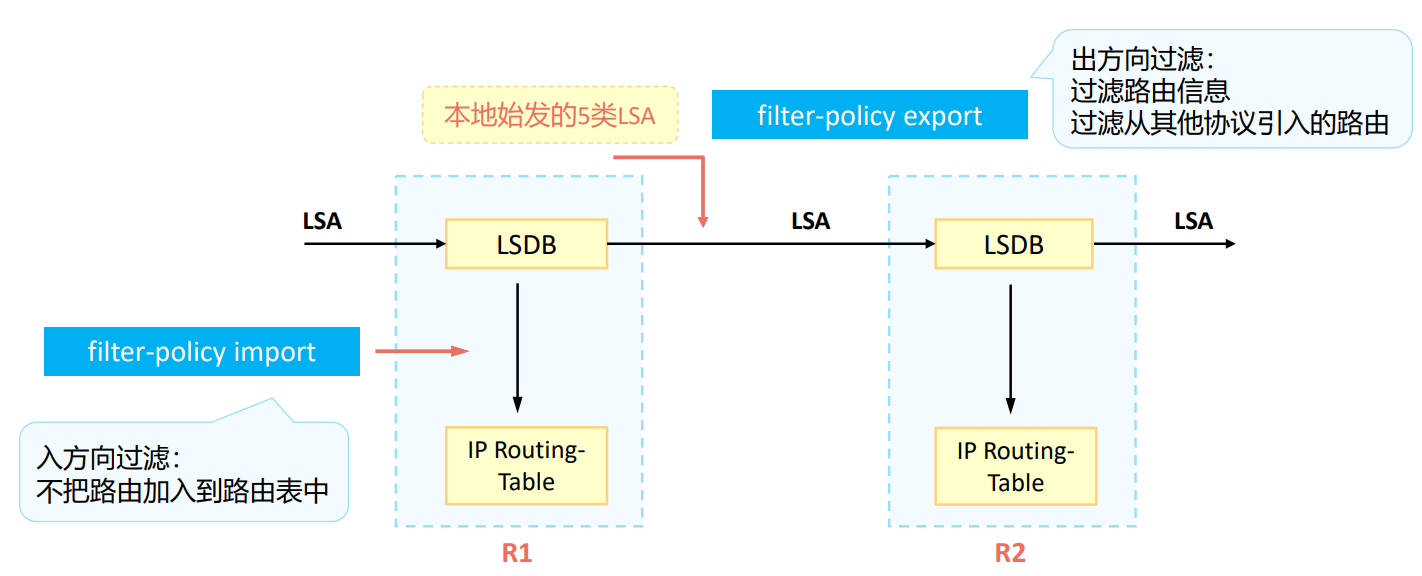 在链路状态路由协议中,各路由设备之间传递的是LSA信息,然后设备根据LSA汇总成的LSDB信息计算出路由表。但是Filter-Policy只能过滤路由信息,无法过滤LSA。