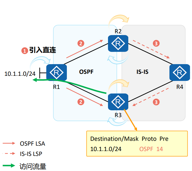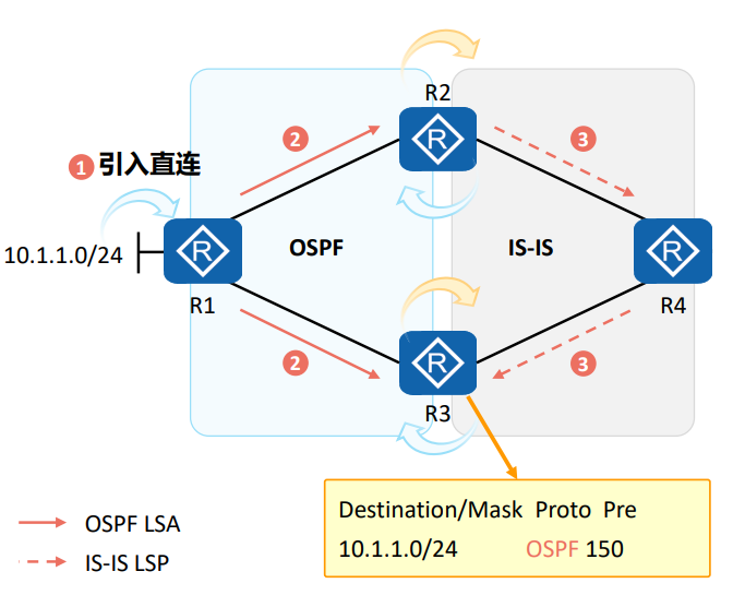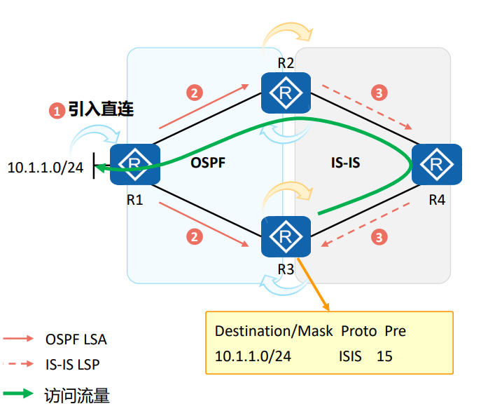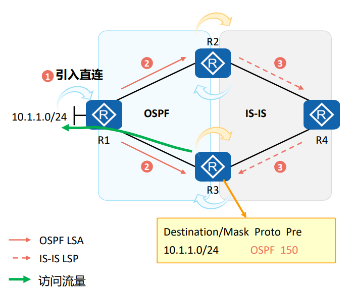 对R3而言,IS-IS路由(优先级15)优于OSPF外部路由(优先级150),因此优选来自R4的IS-IS路由。后续R3访问10.1.1.0/24网段的路径为:R3->R4->R2->R1,这是次优路径。
