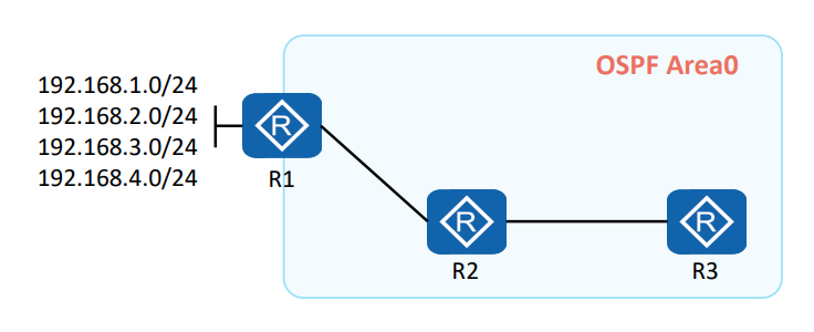 R1 、 R2 、 R3 运 行 OSPF , R1 将 192.168.1.0/24 、192.168.2.0/24、192.168.3.0/24和192.168.4.0/24宣告进OSPF。