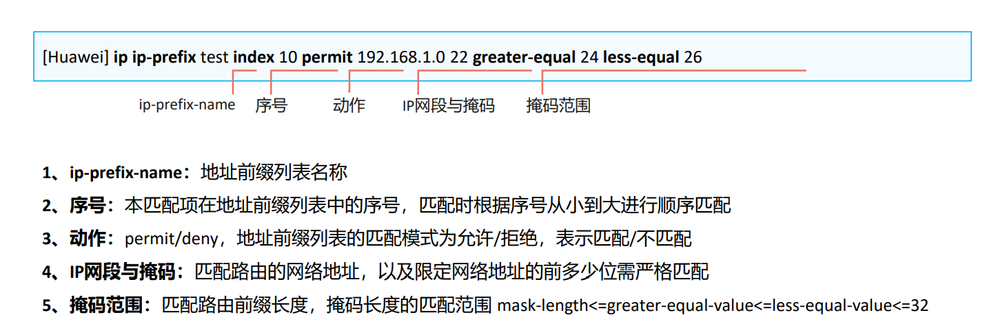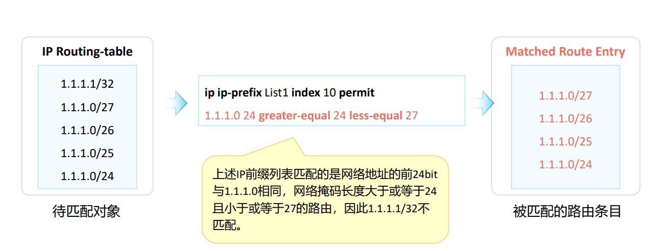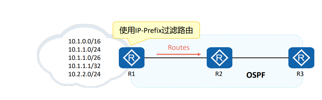 IP前缀列表(IP-Prefix List)是将路由条目的网络地址、掩码长度作为匹配条件的过滤器,可在各路由协议发布和接收路由时使用。