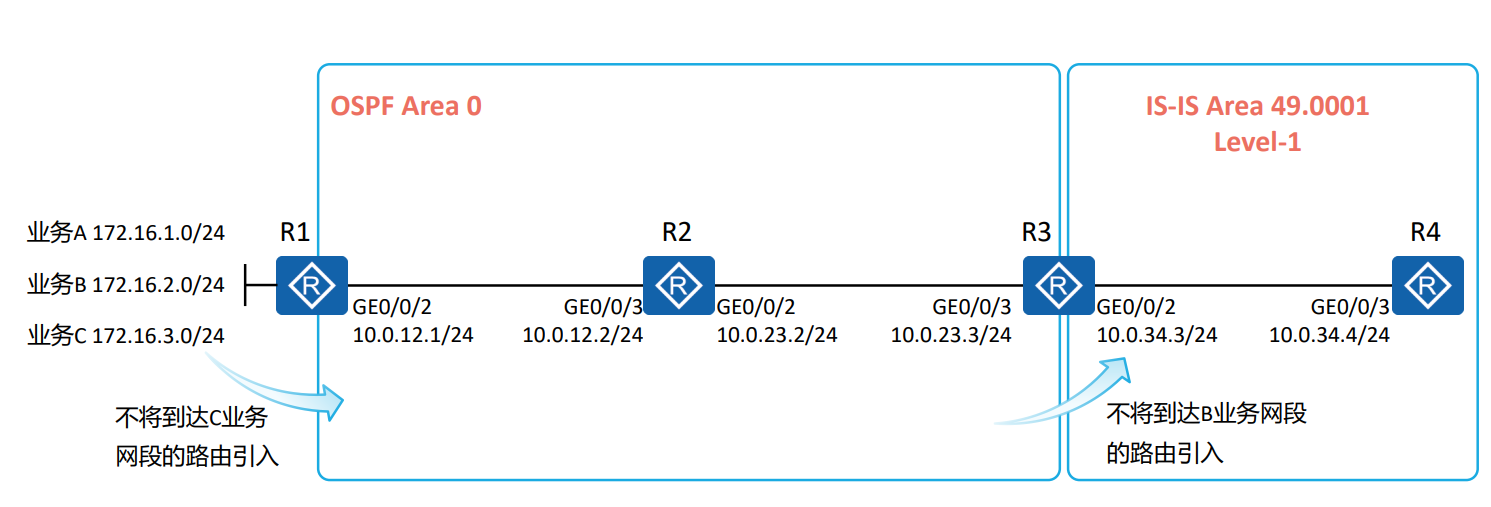 R1上将业务A、B、C的网段路由引入时希望不引入业务C网段路由,同时R3上将OSPF路由引入到IS-IS中时,同样只希望引入B业务网段路由。