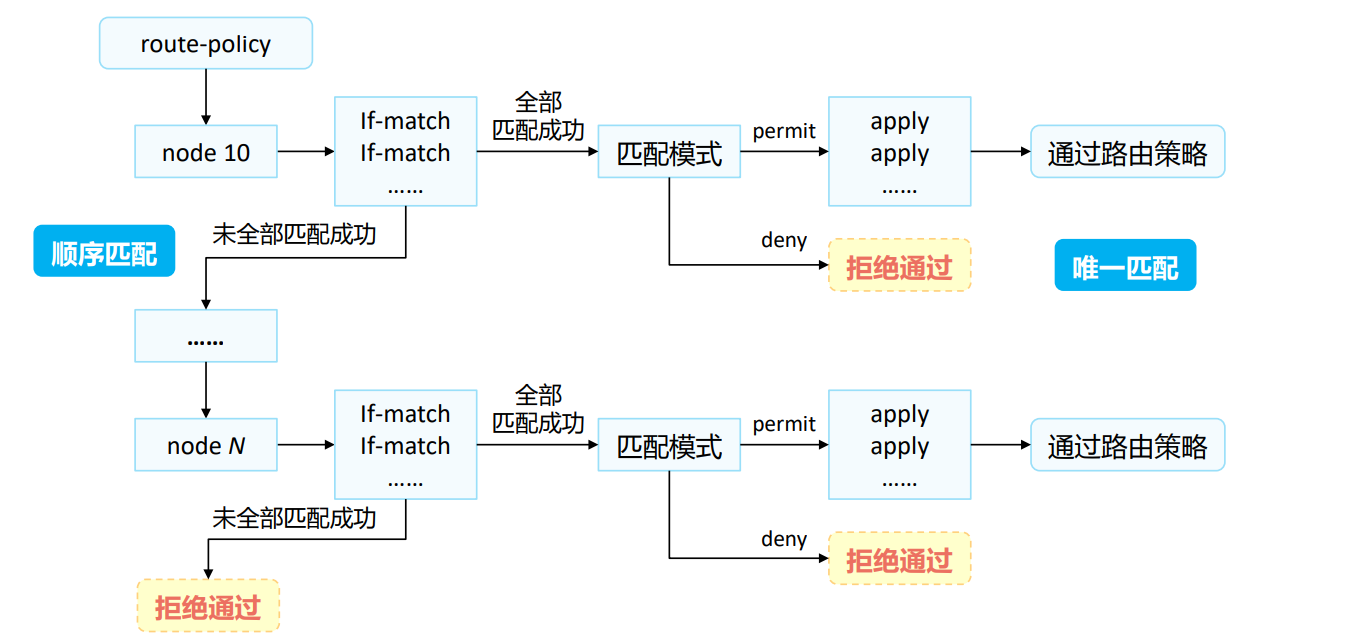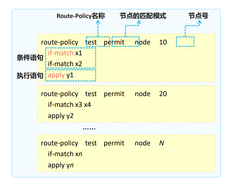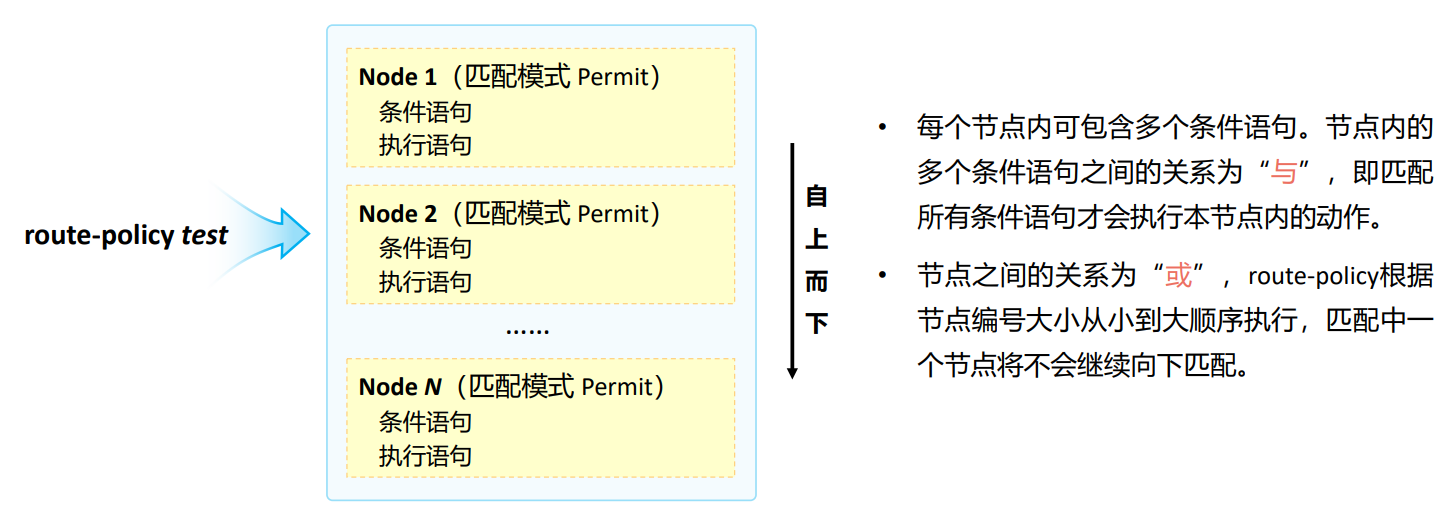 一个Route-Policy由一个或多个节点构成,每个节点包括多个if-match和apply子句。