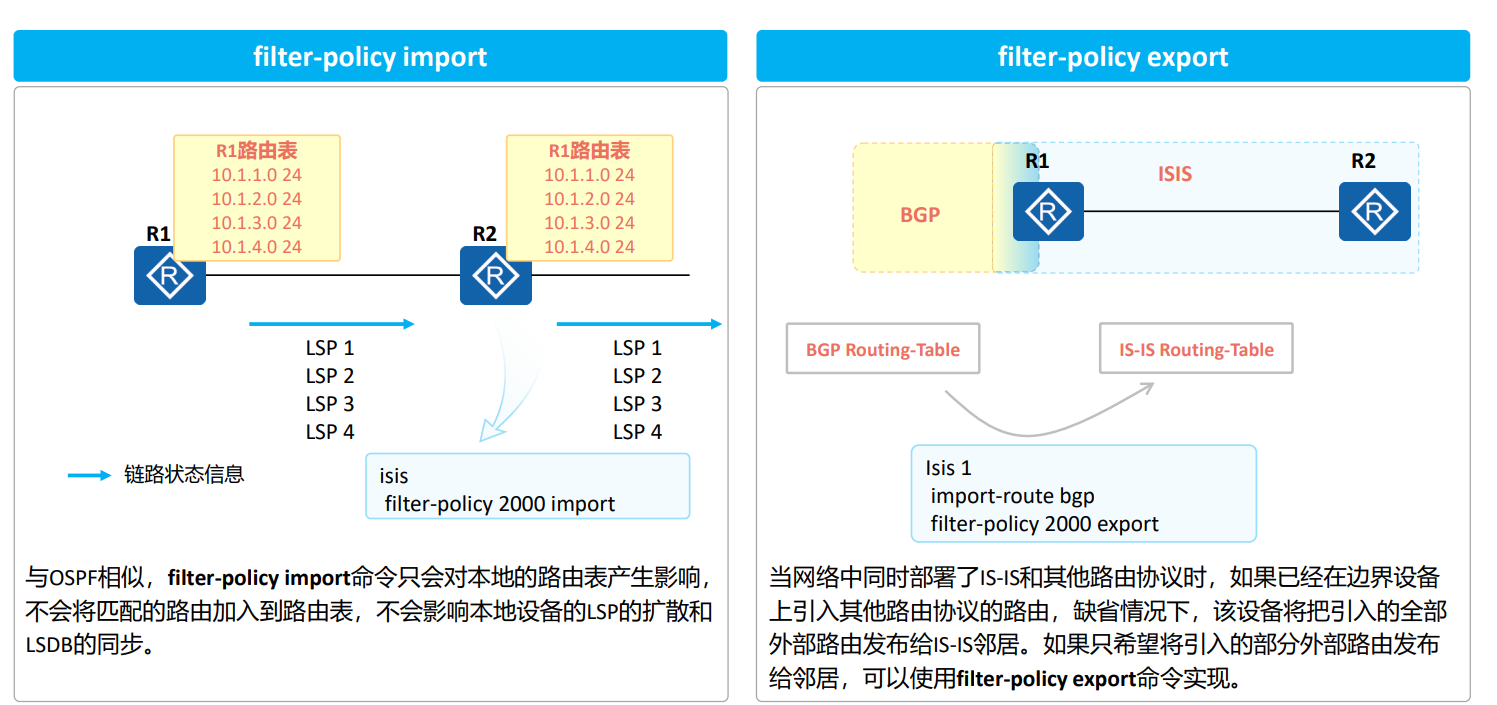 按照过滤策略,设置对引入的路由在向外发布时进行过滤。 - 在IS-IS中的应用