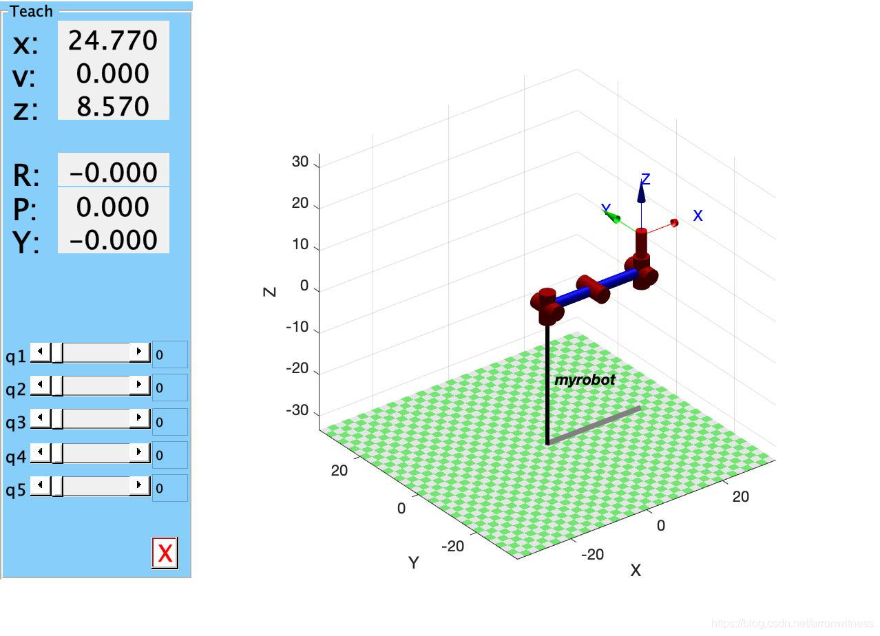 这里会用到的另一个方法是 SerialLink类的一个方法 teach: Drive the graphical robot. 这个可以让你在画图窗口中随时调整每个角度的大小,然后观看手臂的姿态变化,个人认为这对于理解手臂的范围很有帮助。