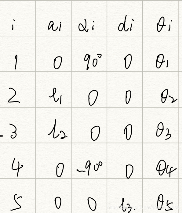 该机械手臂一共是5个自由度。下面把DH table 里的数据学到程序里面去。