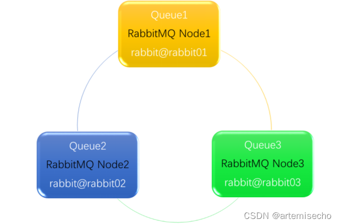 当producer发送消息到Node1节点的Queue1中后,consumer从Node3节点拉取时,RabbitMQ会临时在Node1、Node3间进行消息传输,把Node1中的消息实体取出并经过Node3发送给consumer。
