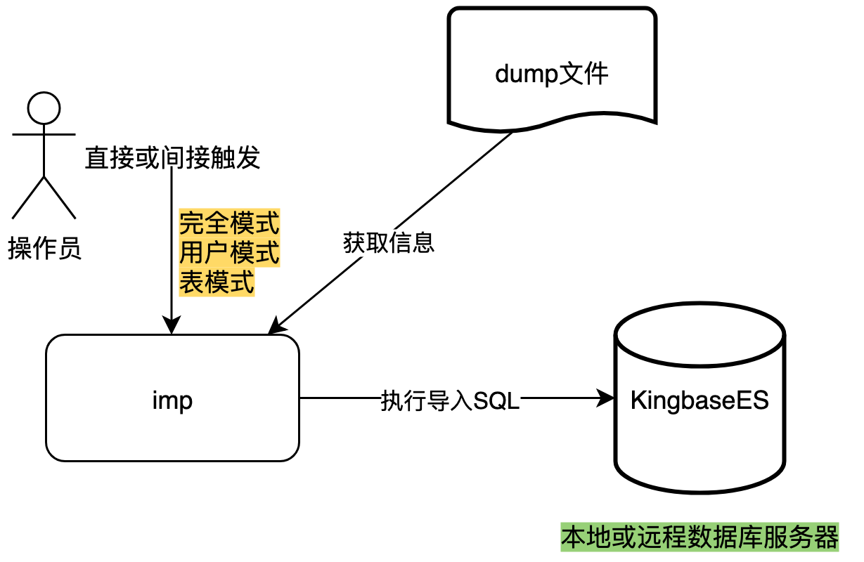 imp工具也是由用户直接执行,或者通过脚本等第三方工具间接触发执行,从exp导出的dump文件中获取具体的数据库对象和内容等信息,并按参数要求将这些信息导入到数据库中。
