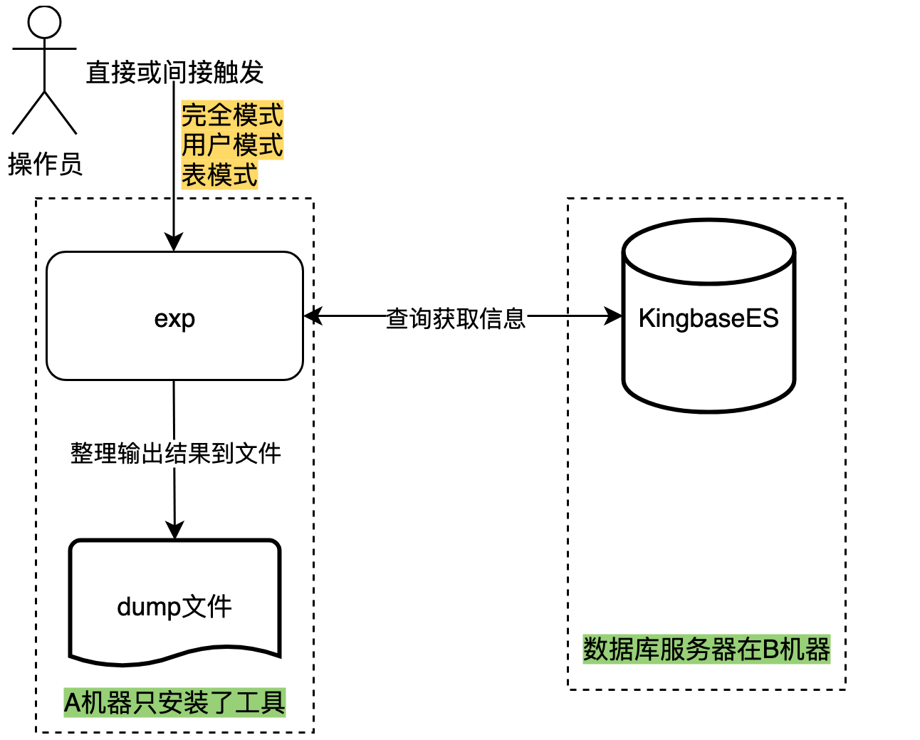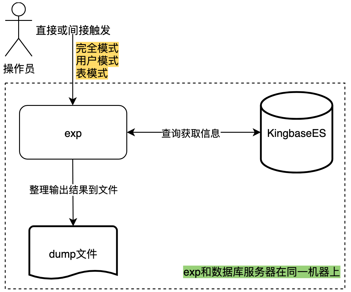 exp工具是由用户直接执行,或者通过脚本等第三方工具间接触发执行,exp连接到指定数据库收集数据对象或内容,最后将这些信息汇总写入到dmp文件中。