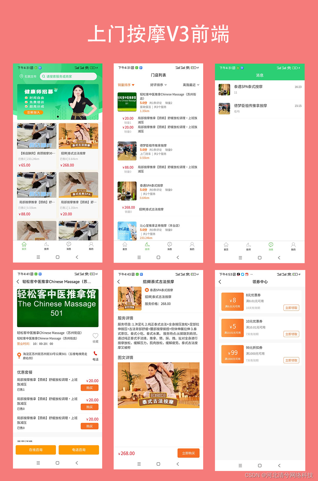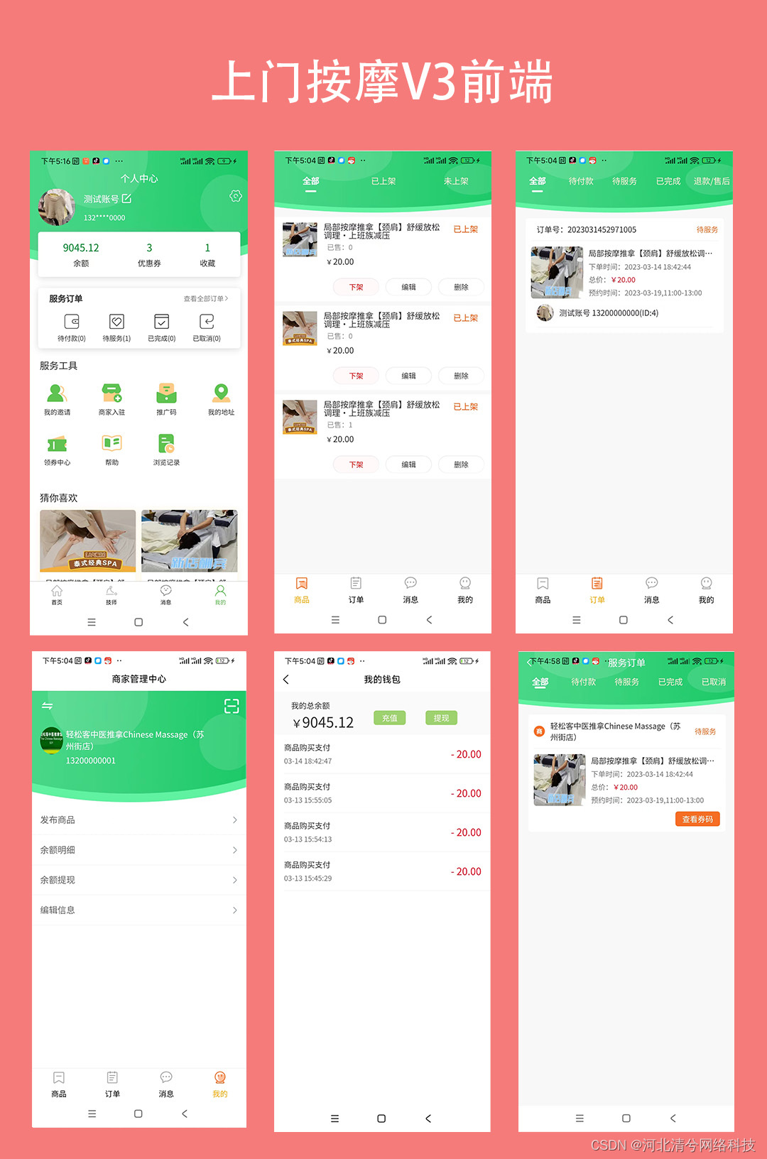 - 订单管理:包括待付款、待服务、已完成、已取消的订单信息,支持用户出示券码让商家核销。