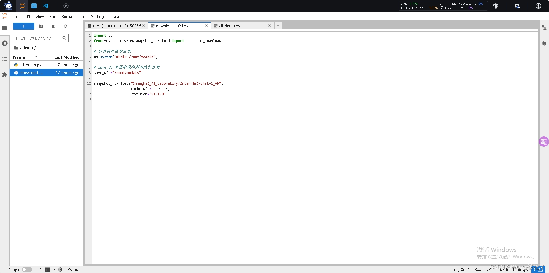 2.轻松分钟玩转书生·浦语大模型趣味 Demo 创作300字小故事:学习和熟练开发机使用、部署八戒:部署自定义模型、本地端口映射lagent:智能体辅助1.1 基本工作:创建基础环境demo、换源、安装demo所需包1.2 下载和启动模型按路径创建文件夹demo,cli_demo.py和download_mini.py,并进入到对应文件目录中。download_mini.py进行模型下载,cli_demo.py启动模型。完整代码见课程链接Tutorial/helloworld/hello_world.md at camp2 · InternLM/T