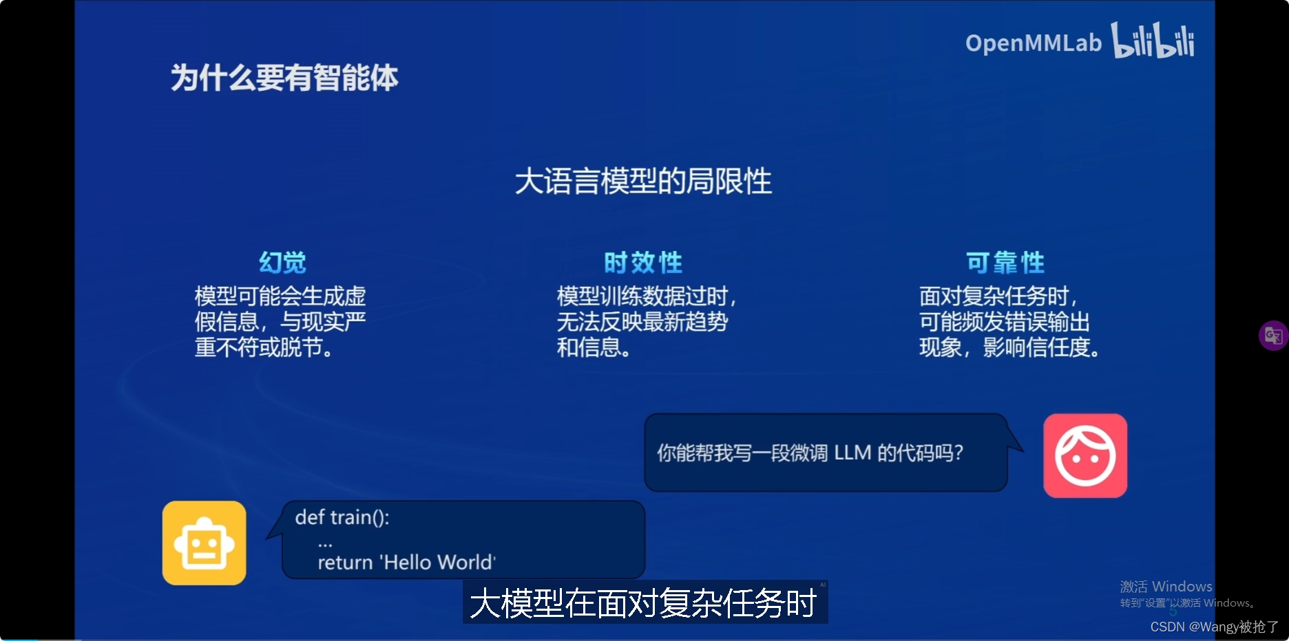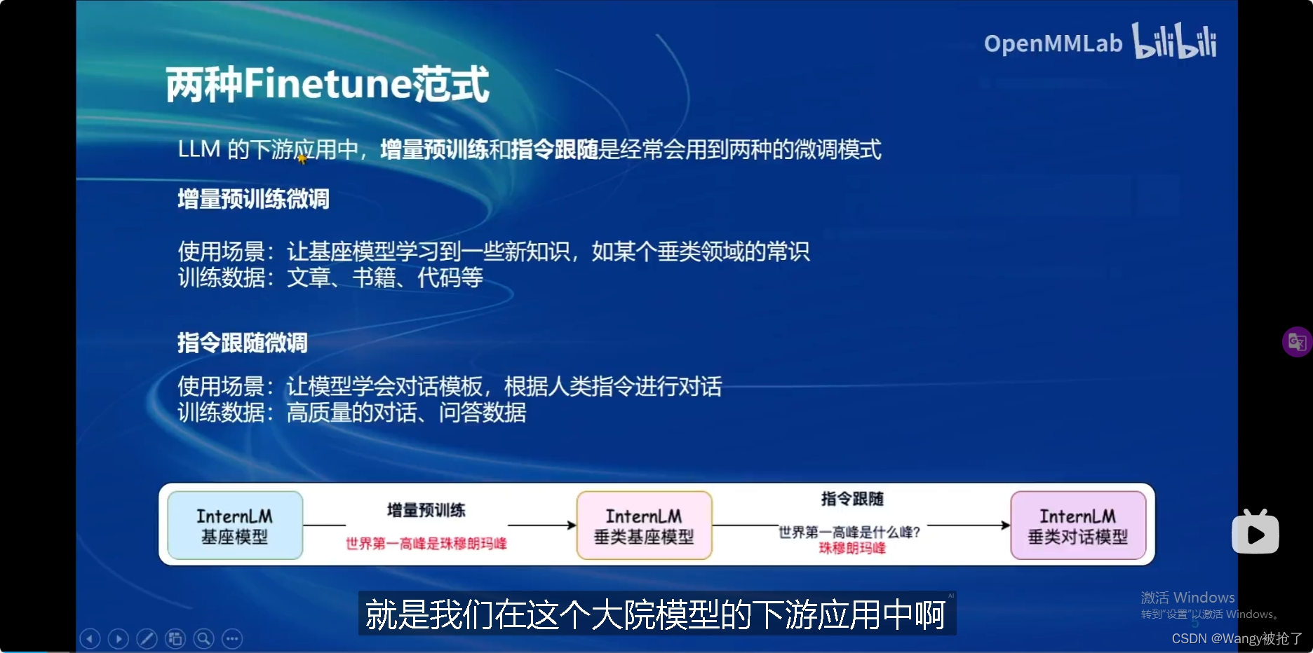1.书生·浦语大模型全链路开源开放体系 —算力不够——》部分参数微调。1.根据榜单选基座模型——任务复杂、算力足够——》需要做全参数微调、增量预训练。3.增量预训练:让基座模型学习垂直领域新知识,用书籍、文章、代码等。2.是否需要与环境交互:构建智能体、评测、部署。2021-2022年,构建专用模型。近两年,多任务多模态的通用大模型。4.微调:理解指令,用问答对。