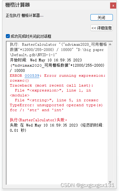 arcgis地图代数(栅格计算器)处理 ndvi数值转换时的报错问题 原因:原始的NDVI数据为经过压缩的0-255的数据,为整形数据,转换为-1~1的数据后存在小数,数据类型不匹配。解决措施:Spatial Analyst》数学分析》逻辑运算》为浮点型数据。