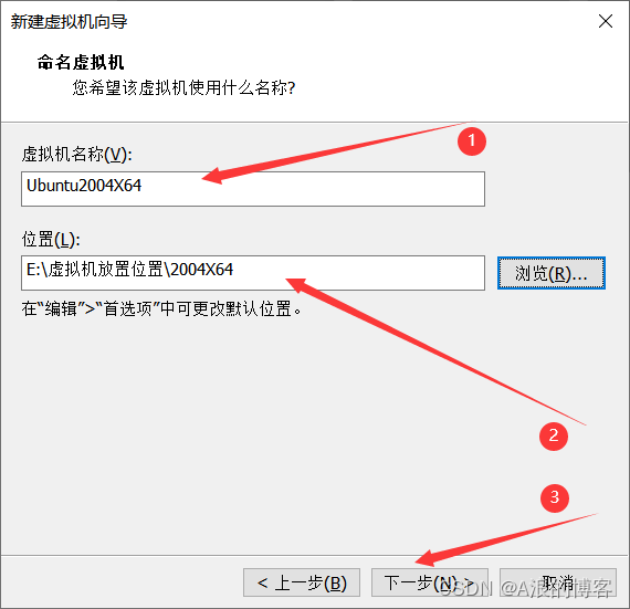 5、编辑虚拟机名字、安装位置,下一步:这里没有要求,改自己喜欢的就行。这里名字我设定为Ubuntu2004X64,安装位置在E:\虚拟机放置位置\2004X64