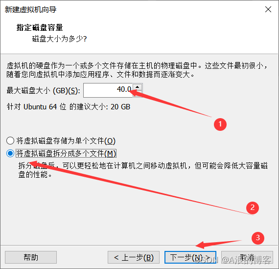6、设置磁盘容量大小、虚拟磁盘存储方式,下一步:关于磁盘大小可以先默认无所谓,后面使用过程中不足可以再加,我这里直接设为40GB,关于虚拟磁盘的存储方式建议设置为跟默认的一致