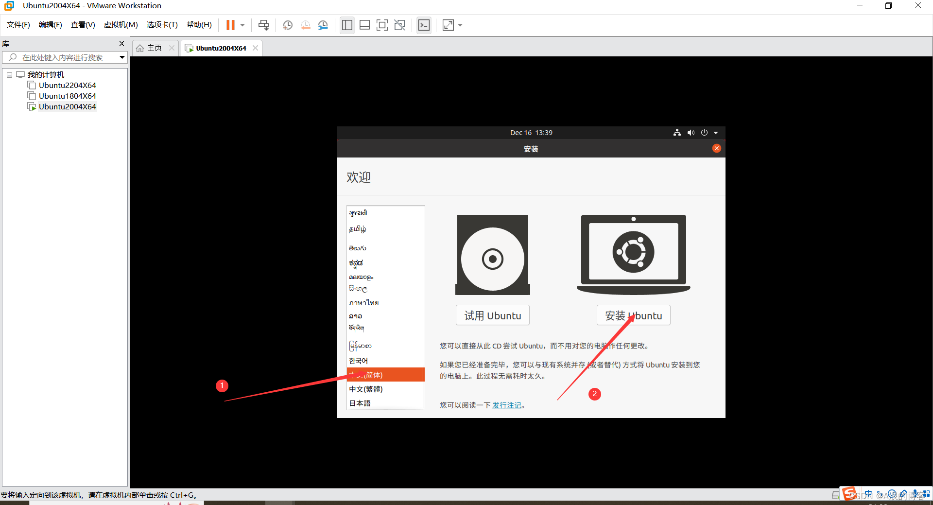 9、稍作等待我们成功进入虚拟机,左边下拉选择语言,之后点击安装Ubuntu: