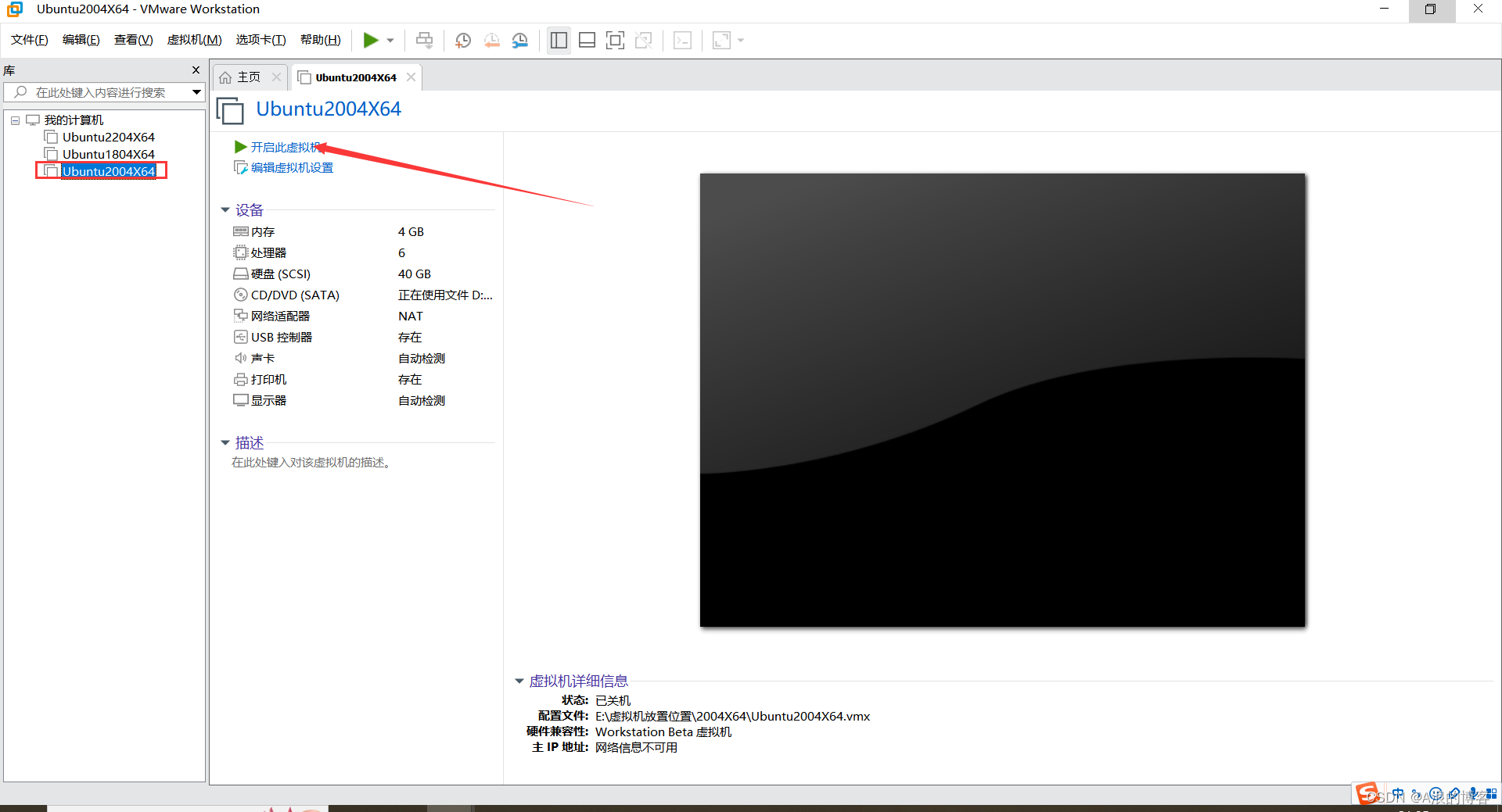 10、经过上面的安装和配置过程,我们开始安装Ubuntu,选中此虚拟机,点击“开启此虚拟机”,等待进入: