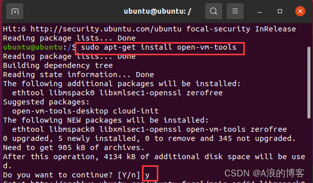 10.2、然后输入sudo apt-get install open-vm-tools ,然后执行回车,给出收到是否继续的提示时输入y,执行回车