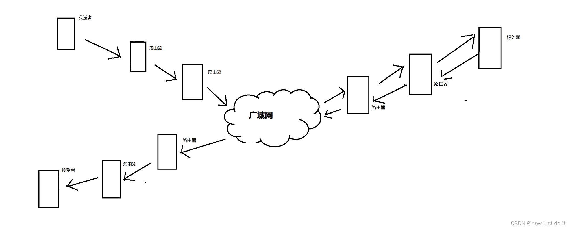 当发送者通过自己的主机将数据封装完成之后,会通过路由器广域网等发送到服务器。当服务器通过分用把数据拆开之后看到接收方的地址,然后服务器将数据重新封装之后,通过路由器广域网等途径发送到接收者的主机,然后接收者的主机一步一步的进行分佣,最终得到数据并且显示出来。