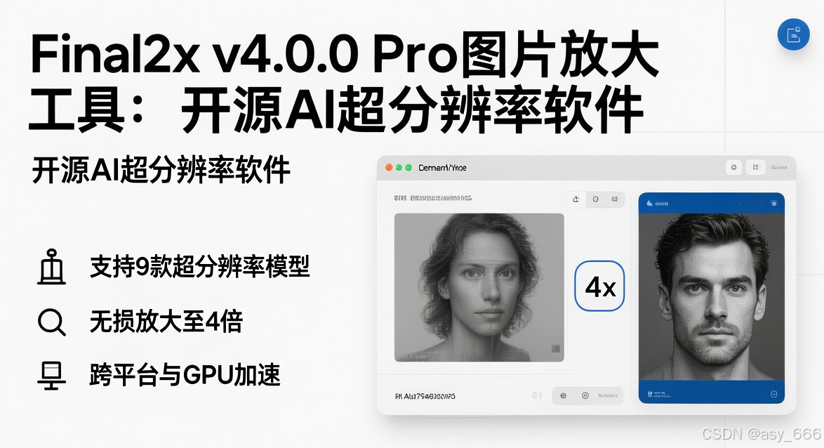 Final2x v4.0.0 Pro是一款开源免费的AI图片放大工具,支持RealCUGAN、RealESRGAN、Waifu2x等9款超分辨率模型,可将图像无损放大至4倍,显著提升分辨率和细节清晰度。软件绿色免安装,支持Windows、macOS和Linux系统,并具有GPU加速功能,适合摄影师、设计师等用户处理高质量图像。