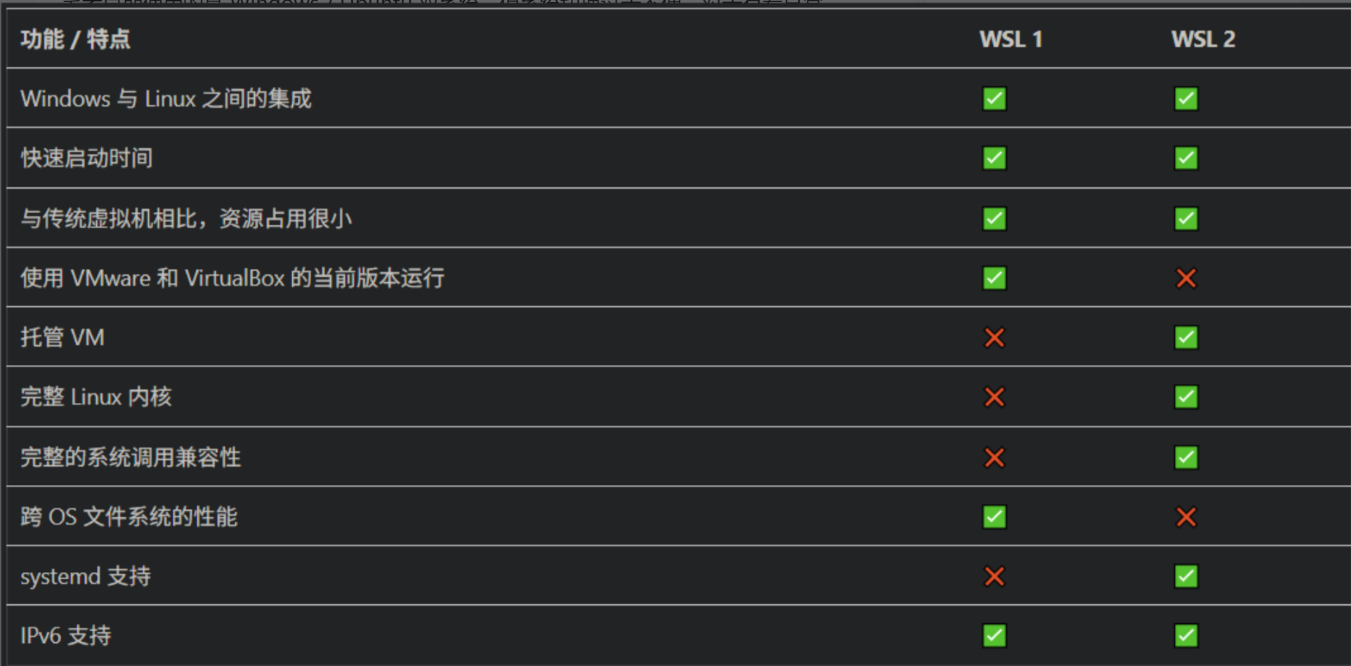 WSL(Windows Subsystem for Linux)是微软开源的一套用于在 Windows 中直接运行 Linux 环境的轻量虚拟化解决方案,弥补了双系统使用不便和虚拟机资源开销大的缺点,并且能够直接访问主机的 GPU。WSL 目前已发展到 WSL2,对比 WSL1 的主要区别如下: