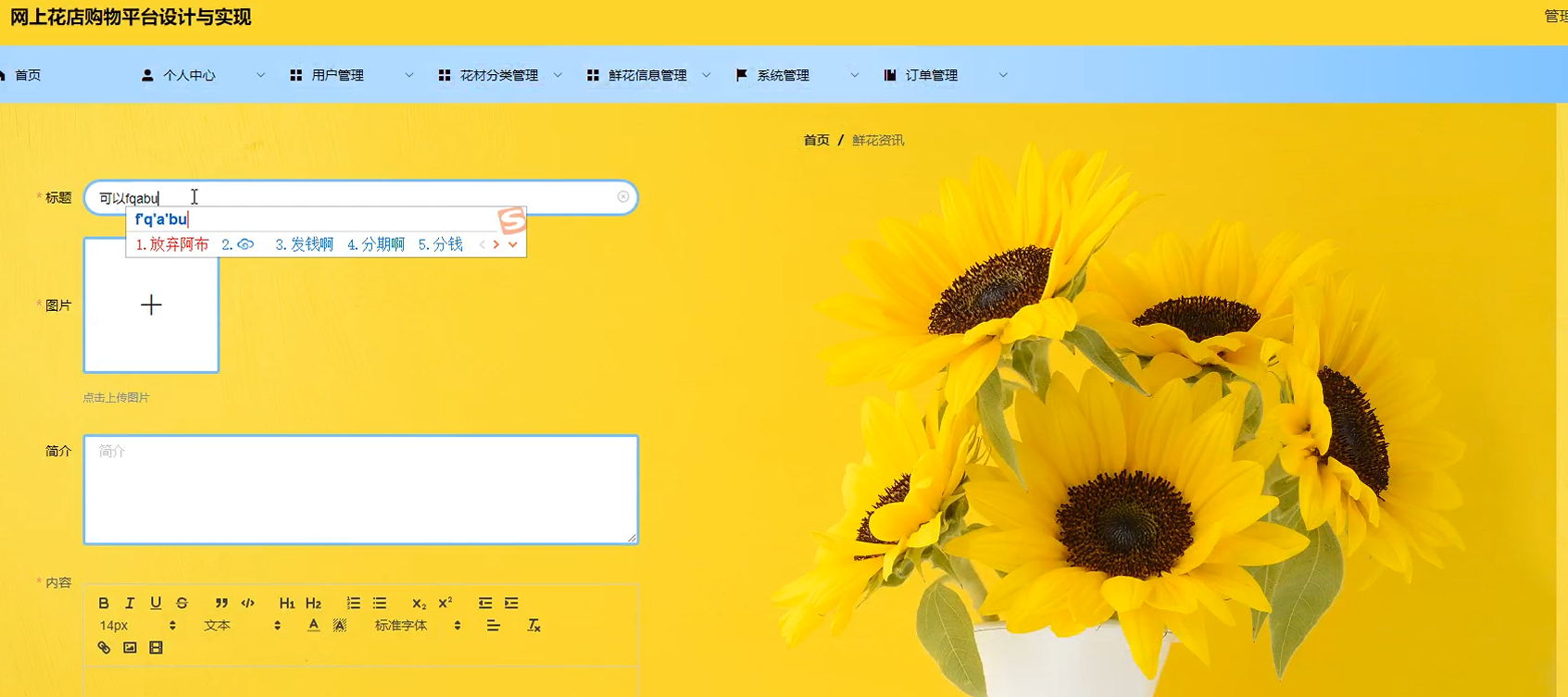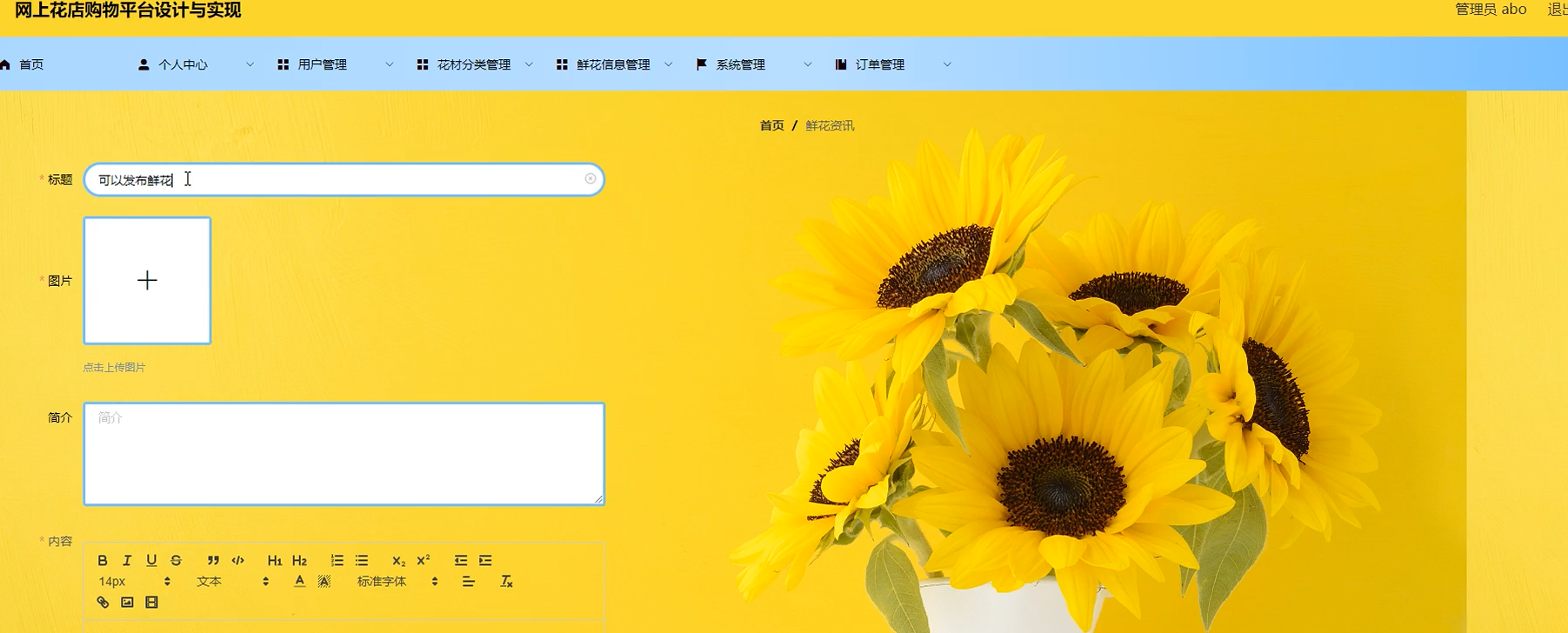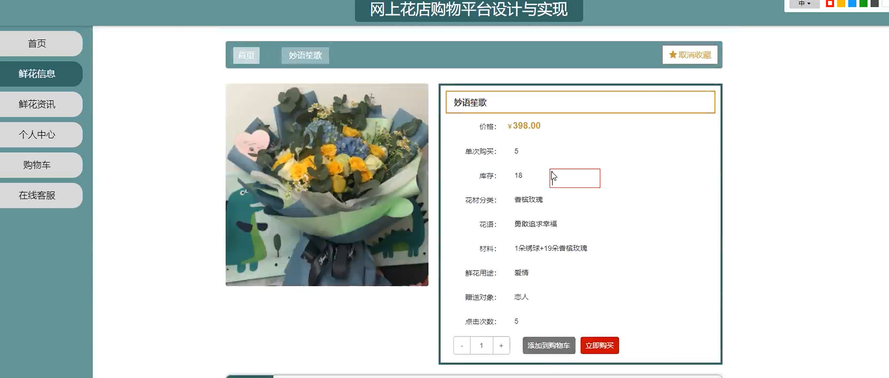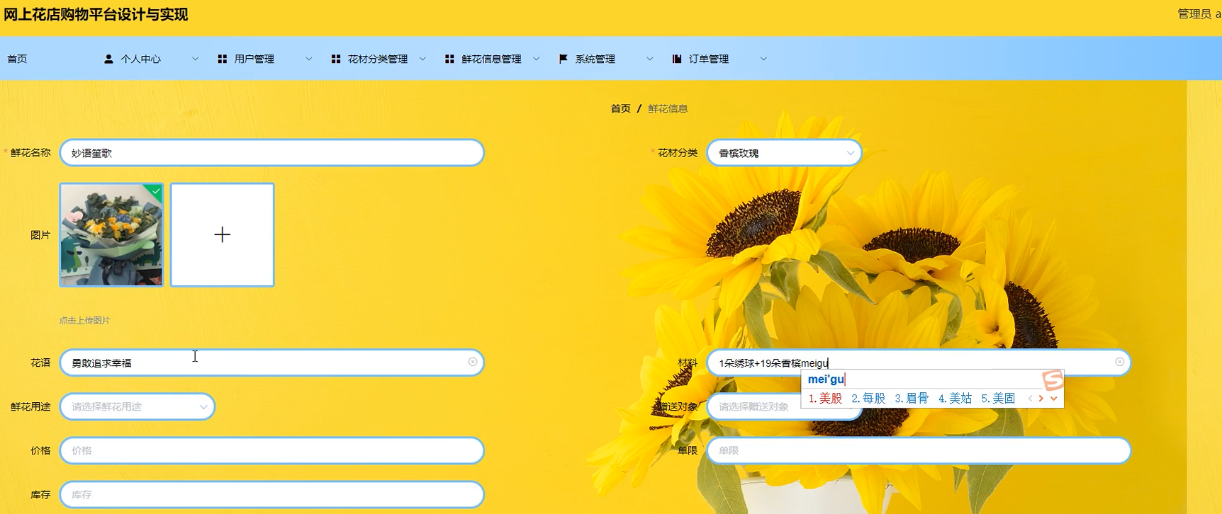 - 鲜花信息管理:支持鲜花的添加、修改、删除及上下架操作,记录鲜花名称、价格、库存、描述等信息,确保鲜花信息的准确性和及时性。
