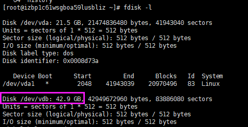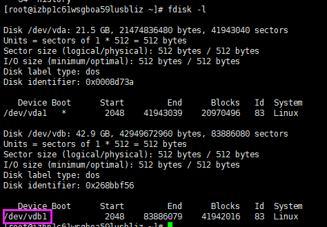 此时再在命令行中输入:fdisk -l 就能看到新建的分区了,如下图所示: