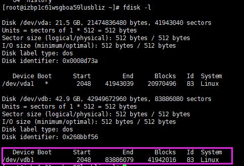 1.查看磁盘:命令行输入:fdisk -l 查看当前的磁盘情况,如下图所示,可以看到有一块额外的40G的硬盘,如下图所示: