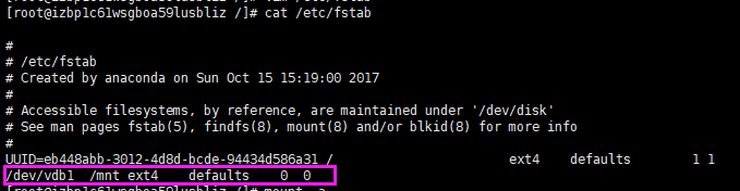 4.写入磁盘分区信息:使用命令:echo '/dev/vdb1 /mnt ext4 defaults 0 0' >> /etc/fstab ,然后使用 cat /etc/fstab 查看,出现以下信息就说明写入成功:
