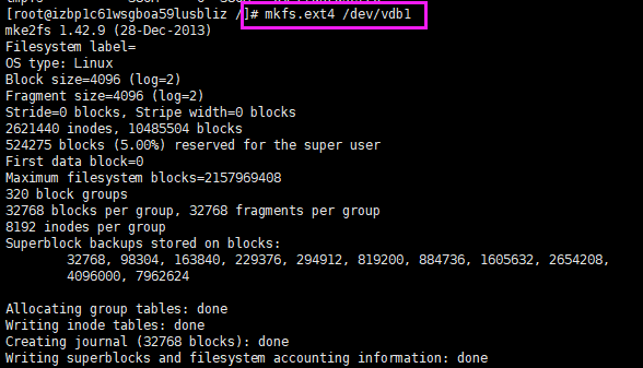 3.磁盘格式化:由于我这个数据盘是新买的,所以需要进行格式化,要是原来就有的磁盘并且上面还存有数据,此步骤要慎重!输入命令:mkfs.ext4 /dev/vdb1,如下图所示: