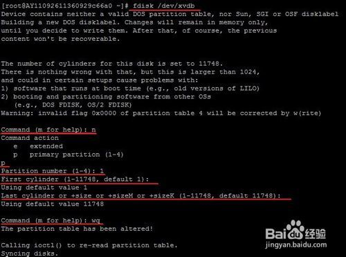 2.磁盘分区:命令行输入: fdisk -S 56 /dev/vdb,然后根据提示,依次输入:”n“、”p“、”1“、两次回车,”wq“,分区也就开始了并很快就可完成。如下图所示(由于我的磁盘已经挂在成功了,当时并没有截图,就用一下别人的图):