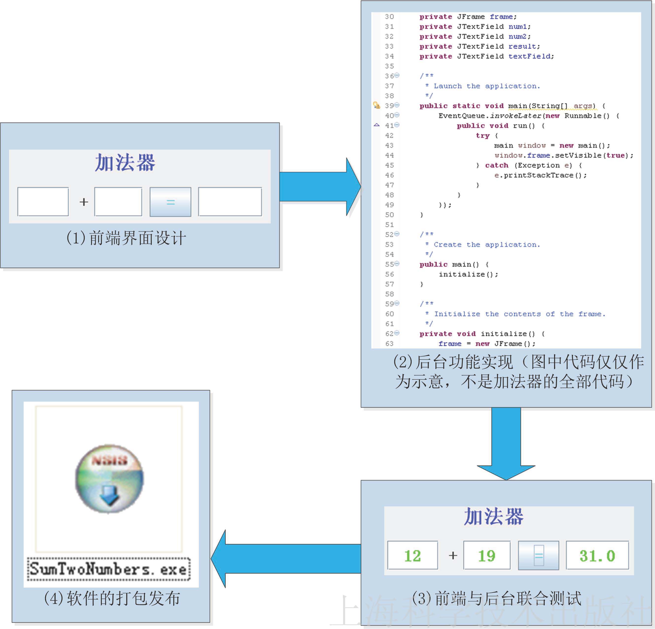 编程类似于学开车,开车只有上路开才能学会,编程就是要面向实战,通过写软件和做项目才能够学会。例如,如果需要开发一个“加法器”软件来实现任意两个实数的相加,那么该软件的开发流程如图 4-5所示。该图形象地展示了开发一个软件的主要流程。首先需要设计一个“加法器”的界面;然后通过后台编写代码实现单击“等号按钮”自动求和的功能,即鼠标单击等号后将用户输入到界面中的两个实数自动求和,再把结果显示在等号右边的文本框中;接下来将前端界面和后台代码进行联合测试;最后,经过测试确定程序没有问题后将程序打包生成后缀名为exe的软件供用户下载安装。读者在学习某一门编程语言时,建议仿照上面的流程自己编写并发布一个软件,如果能够达到这样的水平,则算是初步掌握了该编程语言。