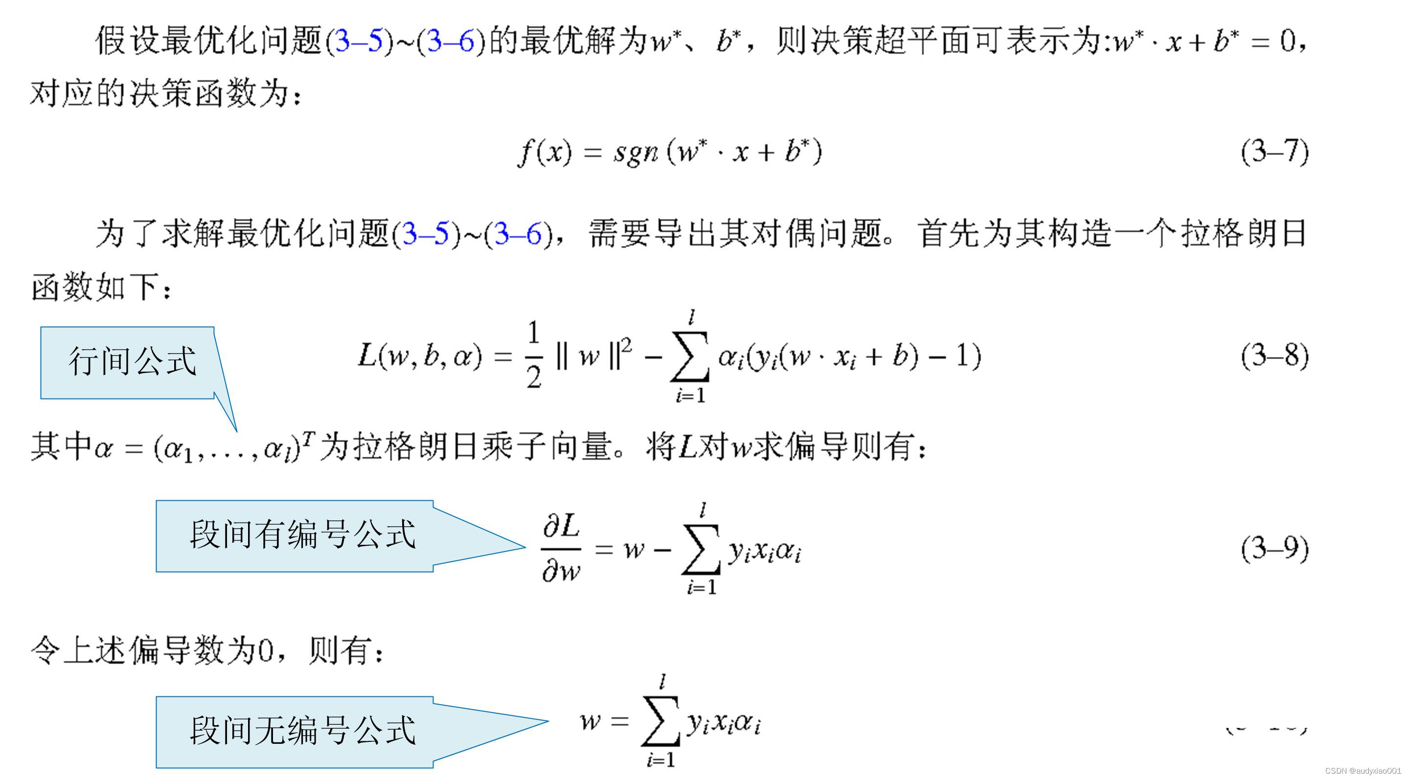 如图 7‑7所示,公式可以分为三种类型,行间公式,段间无编号公式、段间有编号公式。行间公式处于段落内的某一行中,段间无编号公式处于两个段落中间且无编号,段间有编号公式处于两个段落中间且有编号。