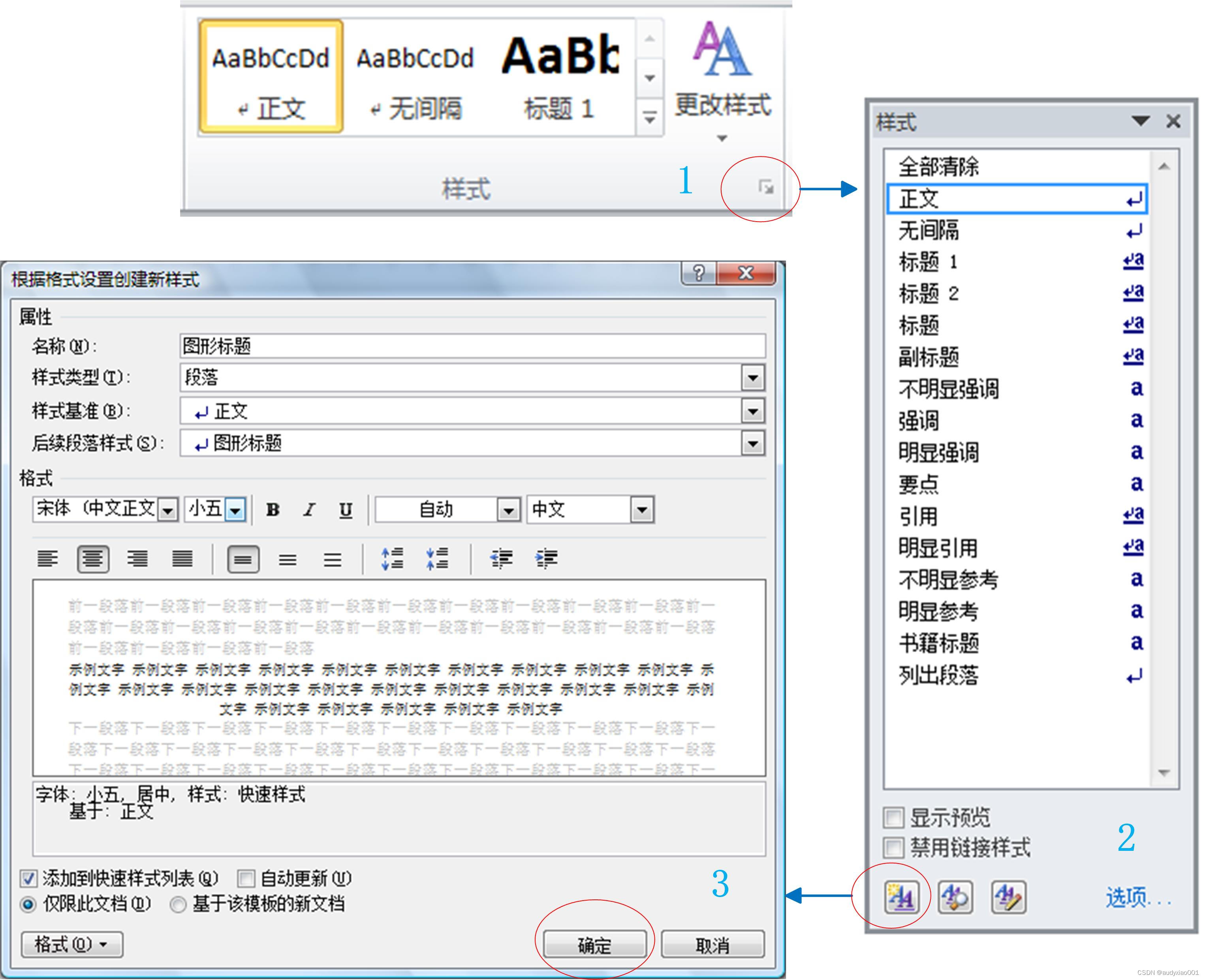 接下来以新建“图形标题”样式来描述为论文各子结构新建样式的方法。如图 7‑6所示,先点击Word“开始”工具栏中的“样式工具栏”的下拉框(即界面1中椭圆框标出的部分),弹出界面2中的样式列表,在界面2中点击椭圆框标出的新建样式图标,弹出界面3所示设置新建样式对话框,修改样式对话框的各个部分,修改完确认无误后点确定即可。标题、正文、各级子标题、算法标题、表格标题、参考文献等其它论文子结构样式的新建方法与上述过程类似,可以仿照上面进行处理。