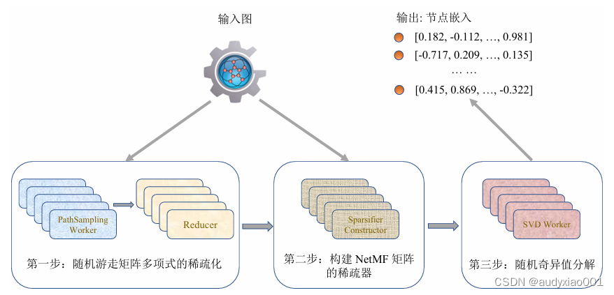 论文对基于随机游走的节点嵌入算法进行了深入的分析,搭建了节点嵌入的图谱理论,并给出了极限情况下DeepWalk等方法隐式分解的矩阵的具体形式。受此启发,论文首先提出了直接计算图2中矩阵并进行矩阵分解的NetMF算法。随后,为了将NetMF扩展到大图上,论文借鉴图谱理论中的随机游走矩阵多项式稀疏化的技术对NetMF进行了改造,提出了稀疏矩阵分解算法NetSMF。最后,通过进一步算法和系统的协同设计提出了LIGHTNE系统,该系统可以扩展到十亿节点和千亿条边的超大图。