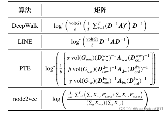 图2 DeepWalk,LINE,PTE和node2vec算法隐式分解的矩阵