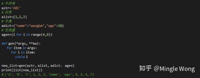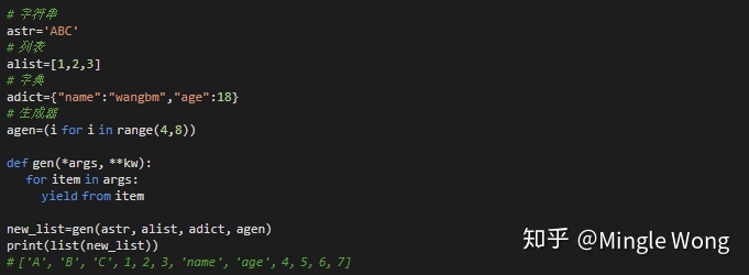 yield from 后面需要加的是可迭代对象,它可以是普通的可迭代对象,也可以是迭代器,甚至是生成器。