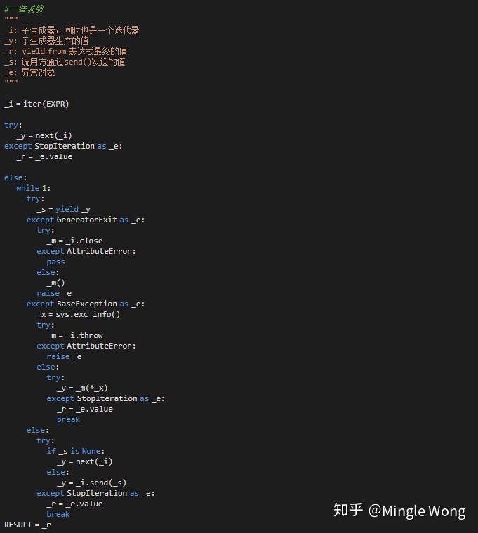 没兴趣看的同学,只要知道,yield from帮我们做了很多的异常处理,而且全面,而这些如果我们要自己去实现的话,一个是编写代码难度增加,写出来的代码可读性极差,这些我们就不说了,最主要的是很可能有遗漏,只要哪个异常没考虑到,都有可能导致程序崩溃什么的。