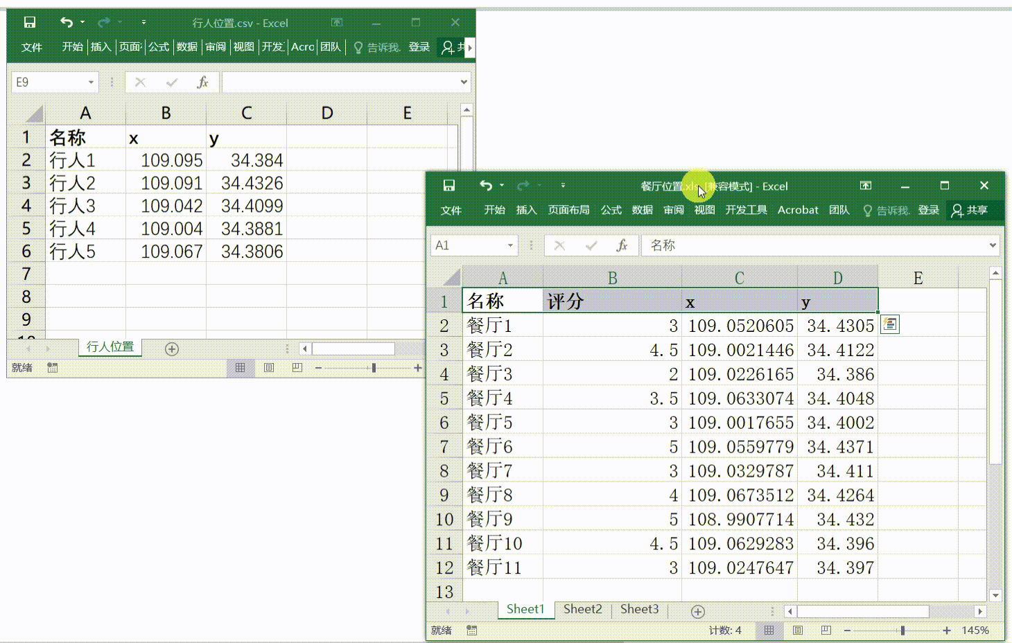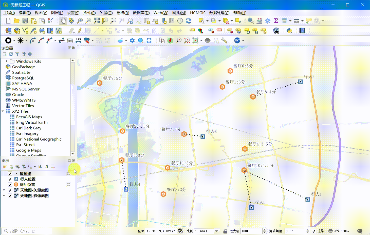 效果图 如下图,由xls、csv文件导入餐厅与行人位置。标注出所有餐厅行人,计算并绘制出行人距自己最近的餐厅与距离。 具体操作步骤 1、由xls、csv文件导入餐厅与行人位置 2、标注出所有餐厅行人 3、计算出行人距自己最近的餐厅与距离 4、绘制出行人距自己最近的餐厅与距离 关注 笔者 - jxd