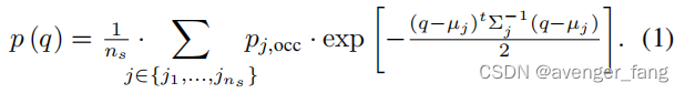 在每个子图中,测量一个点q的可能性由栅格j的样本分布Nj(µj,Σj)的非归一化概率密度函数得到,再乘以栅格j的占用概率pj,其中j是落入栅格q的概率。q的完全似然值是通过建立所有ns子图的平均值而得到的: