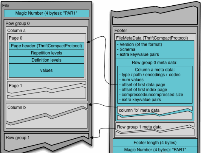 通常情况下,在存储Parquet数据的时候会按照Block大小设置行组的大小,由于一般情况下每一个Mapper任务处理数据的最小单位是一个Block,这样可以把每一个行组由一个Mapper任务处理,增大任务执行并行度。Parquet文件的格式如下图所示。