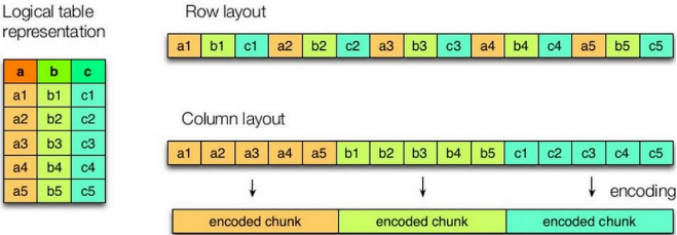 上图左边为逻辑表,右边第一个为行式存储,第二个为列式存储。