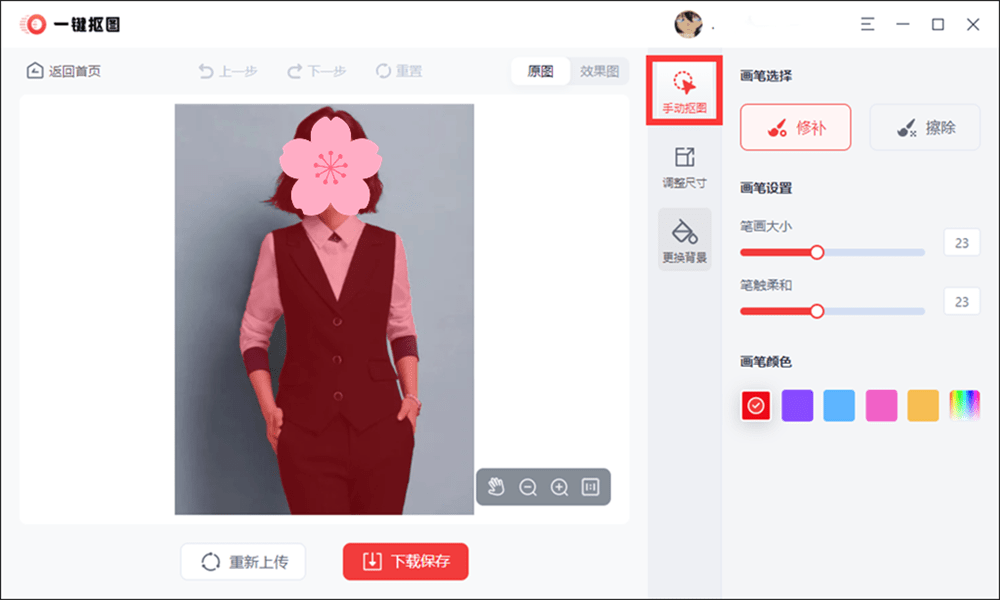 第二步 选择好我们需要的功能选项之后,点击上传我们提前准备好的图片文件,上传完成之后,系统会对其进行自动抠图。抠好的图片,可以点击【手动抠图】选项,对图片的细节进行一些处理。