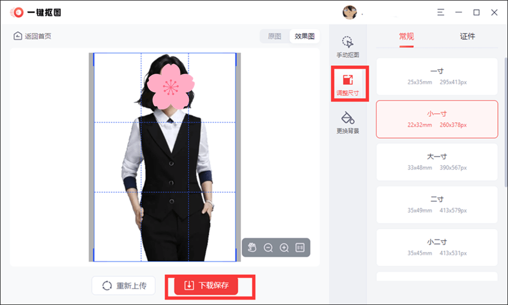 第四步 编辑处理好图片之后,最后我们点击选择【调整尺寸】,对图片的尺寸大小进行调整。编辑完成后的证件照文件,点击【下载保存】即可。