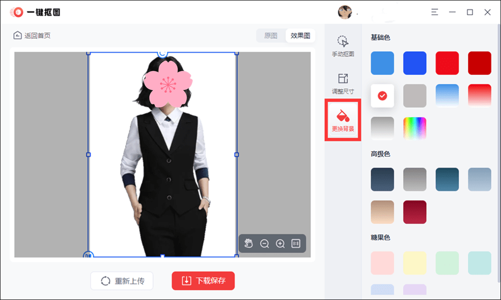 第三步 抠好了图片之后,接下来我们点击【更换背景】选项,调整照片的底色,系统内设各种常见的底色,也可以点击在调色板中选择相应的底色。