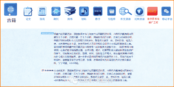 古籍库4个 + 论文库2个 + 报纸库1个 + 期刊库5个 + 图书库6个 + 视听库5个 + 教学库3个 + 专题库7个 + 外文资源1个 + 试用库59个