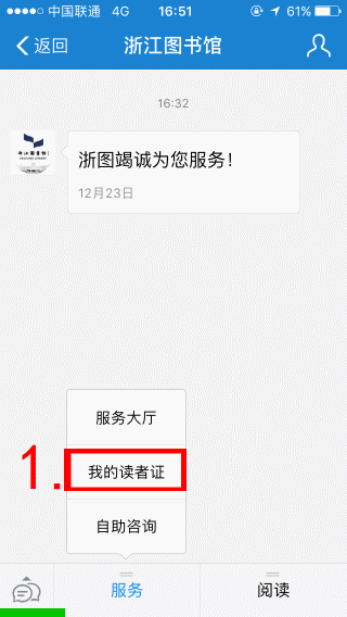 - 关注之后点击「服务」,再点击「办理读者证」填写注册信息