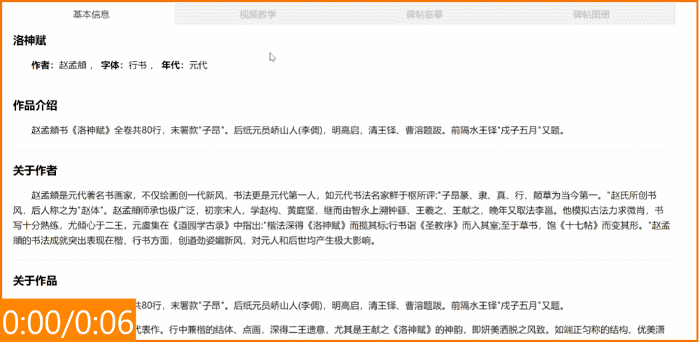 每个字帖有详细介绍、详细的单字视频教学、还有单字的碑帖临摹与整帖的高清大图!