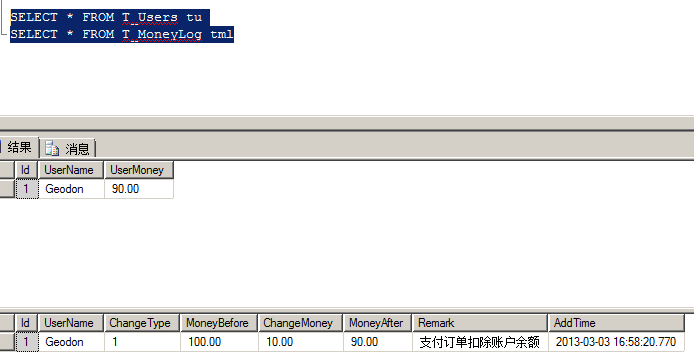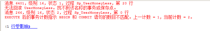 这个存储过程包含了一个事务,而且在事务的内部又调用了Sp_UserMoneyLess,而Sp_UserMoneyLess这个存储过程内部又包含了一个事务,这就出现了事务嵌套的场景,这也正是本文要讨论的内容。