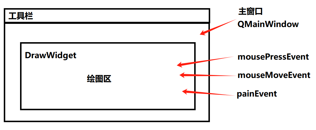 实现一个简单的绘图工具,可以选择线型、线宽、颜色等基本要素。QMainWindow 对象作为主窗口,QToolBar 对象作为工具栏,QWidget 对象作为主窗口的中央窗体,也就是绘图区。通过响应鼠标事件进行绘图,而这是在绘图区窗体完成的,所以首先实现此窗体 DrawWidget 对鼠标事件进行重定义;然后实现可以选择线型、线宽及颜色等基本要素的主窗口。
